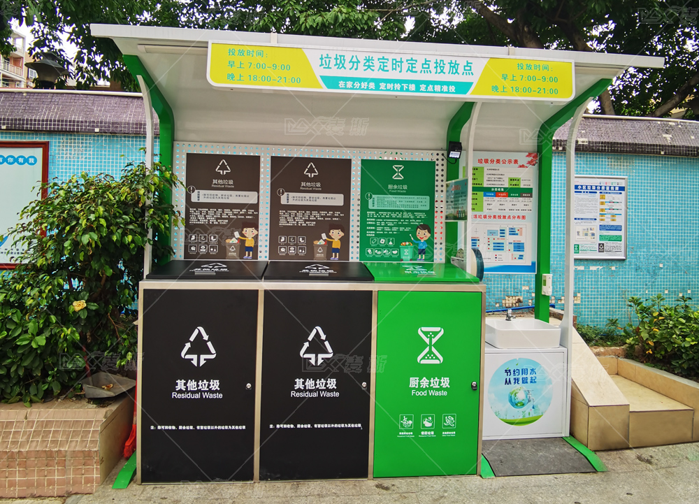 麦斯为社区因地制宜的设置垃圾分类项目配套设施。雨棚有效遮挡雨水进入垃圾桶;顶部节能灯便于居民夜间投放;清晰的垃圾分类宣传广告与垃圾分类标识有助于引导居民分类投放;配备擦手纸、洗手液、清洁台等便民清洁设备,有效体现净化、美化环境的作用;MAX-HB240手提式开盖箱体,铝制提手,光滑不割手;液压缓降,减少噪音污染;开盖可定点,便于多次投放,减少开合频率。